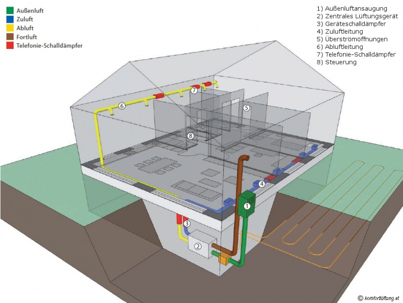 Die frische Außenluft wird über die Außenluftansaugung dem Lüftungsgerät zugeführt. Dort wird die Außenluft gefiltert und erwärmt. Dazu wird sie über einen Wärmetauscher geführt und mit der warmen Abluft aus dem Gebäude temperiert. Frischluft und Abluft kommen dabei nicht in Berührung. Über die Zuluftleitung wird die Frischluft in die Wohn- und Schlafräume geleitet. Anschließend gelangt sie über den Gang zu Küche und Sanitärräumen. Von dort kommt die „verbrauchte“ Luft über die Abluftleitung wieder zurück zum Lüftungsgerät, wird im Wärmetauscher zur Erwärmung der Frischluft genutzt und anschließend über die Fortluftleitung ins Freie geführt.