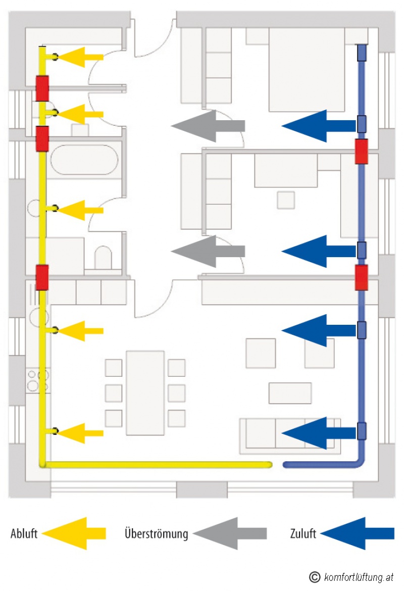 Mit diesem System wird die Luft mehrfach genutzt: Frischluft wird über Schlaf- und Wohnzimmer bis zur Küche zum Belüften genutzt. Von dort wird die „verbrauchte“ Luft über die Abluftleitung wieder abgeführt.