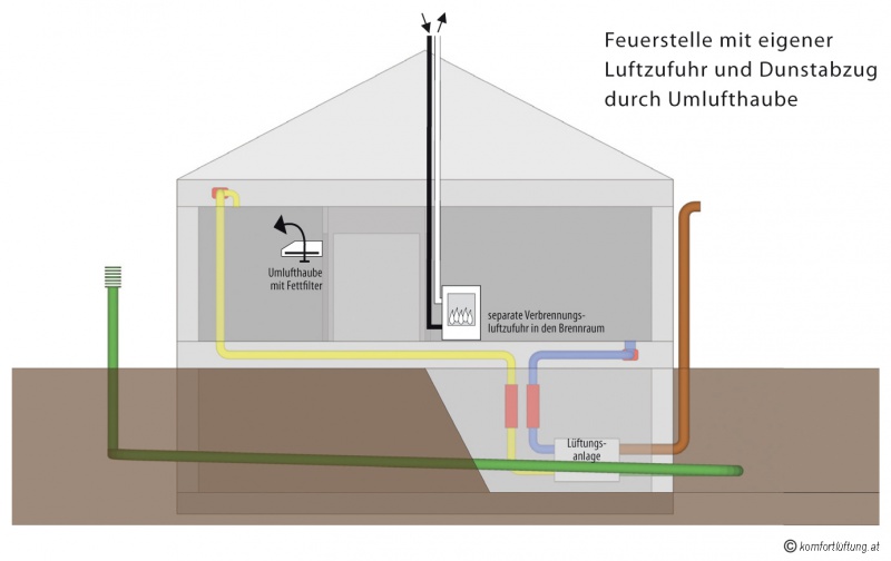 Feuerstellen bei Gebäuden mit Komfortlüftungsanlagen müssen raumluftunabhängig betrieben werden oder mit einer Sicherheitseinrichtung ausgestattet sein. Raumluftunabhängig ist eine Feuerstelle dann, wenn sie über eine eigene Luftzufuhr verfügt und der Ofen als „dicht“ bzw. „raumluftunabhängig“ geprüft ist. Generell sollten Feuerstellen in neuen Gebäuden über eine eigene Luftzufuhr verfügen.