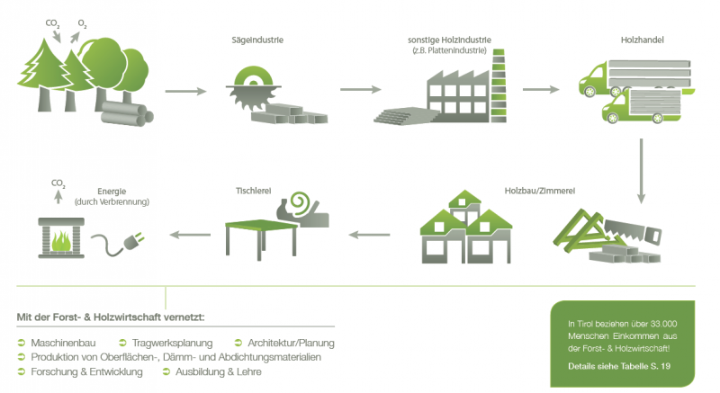 In Tirol nimmt der Wald 41% der Landesfläche ein. Sowohl die Produktion, als auch die Weiterverarbeitung von Holz spielen in Tirol eine bedeutende wirtschaftliche Rolle.